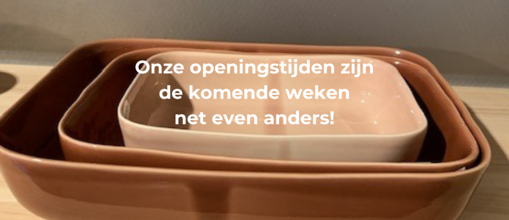 De komende weken zijn onze openingstijden net even anders dan anders. De winkel in Haarlem gaat op donderdag een uurtje later open, namelijk om 12.00 uur. Woensdag 22 t/m vrijdag 24 januari is de winkel gesloten, dan zijn we er éven niet. Zaterdag 25 januari zijn we er weer fris en fruitig! Plan je een bezoek, check dus even onze openingstijden. PS: deze mooie ovenschalen vind je hier.